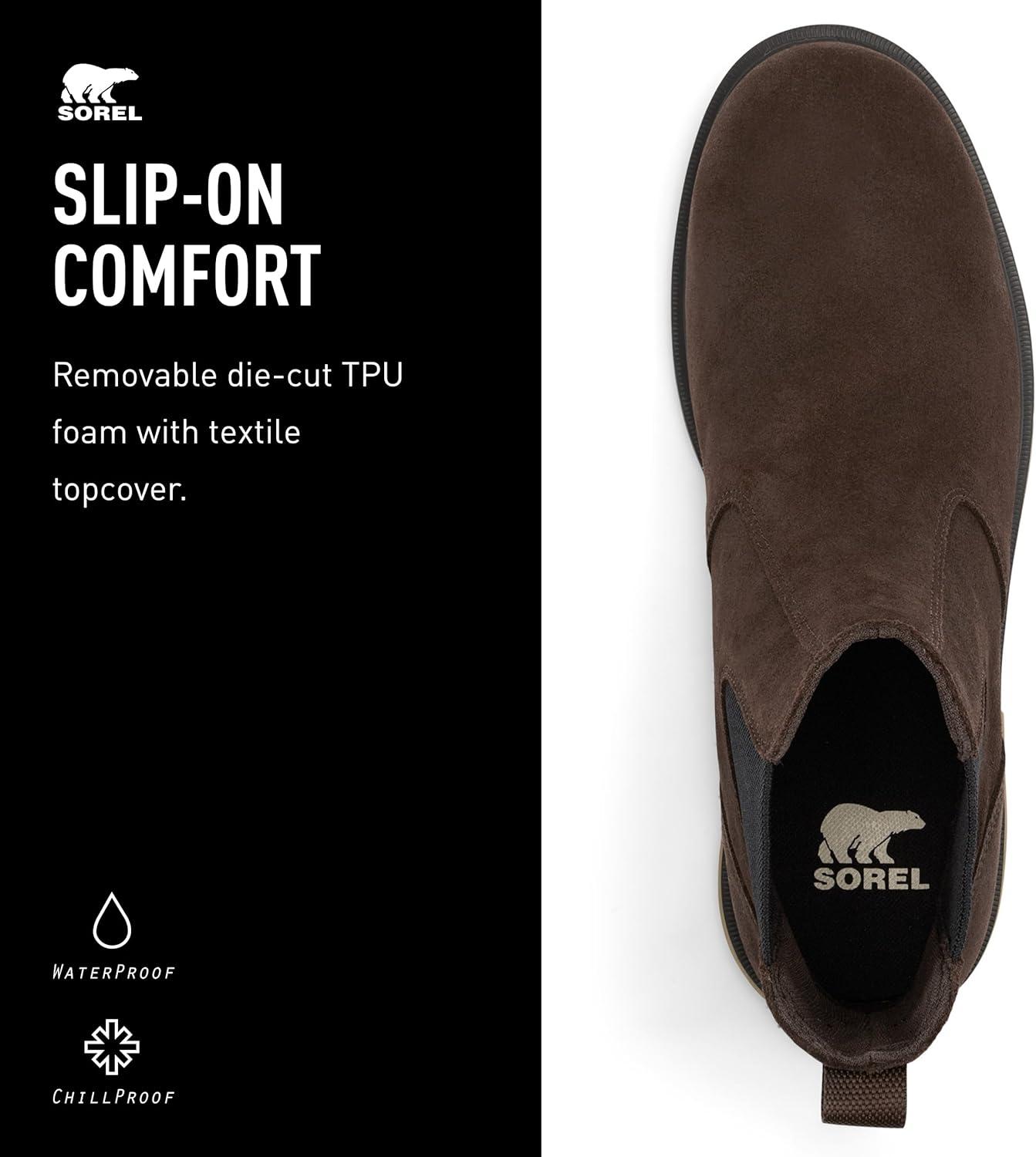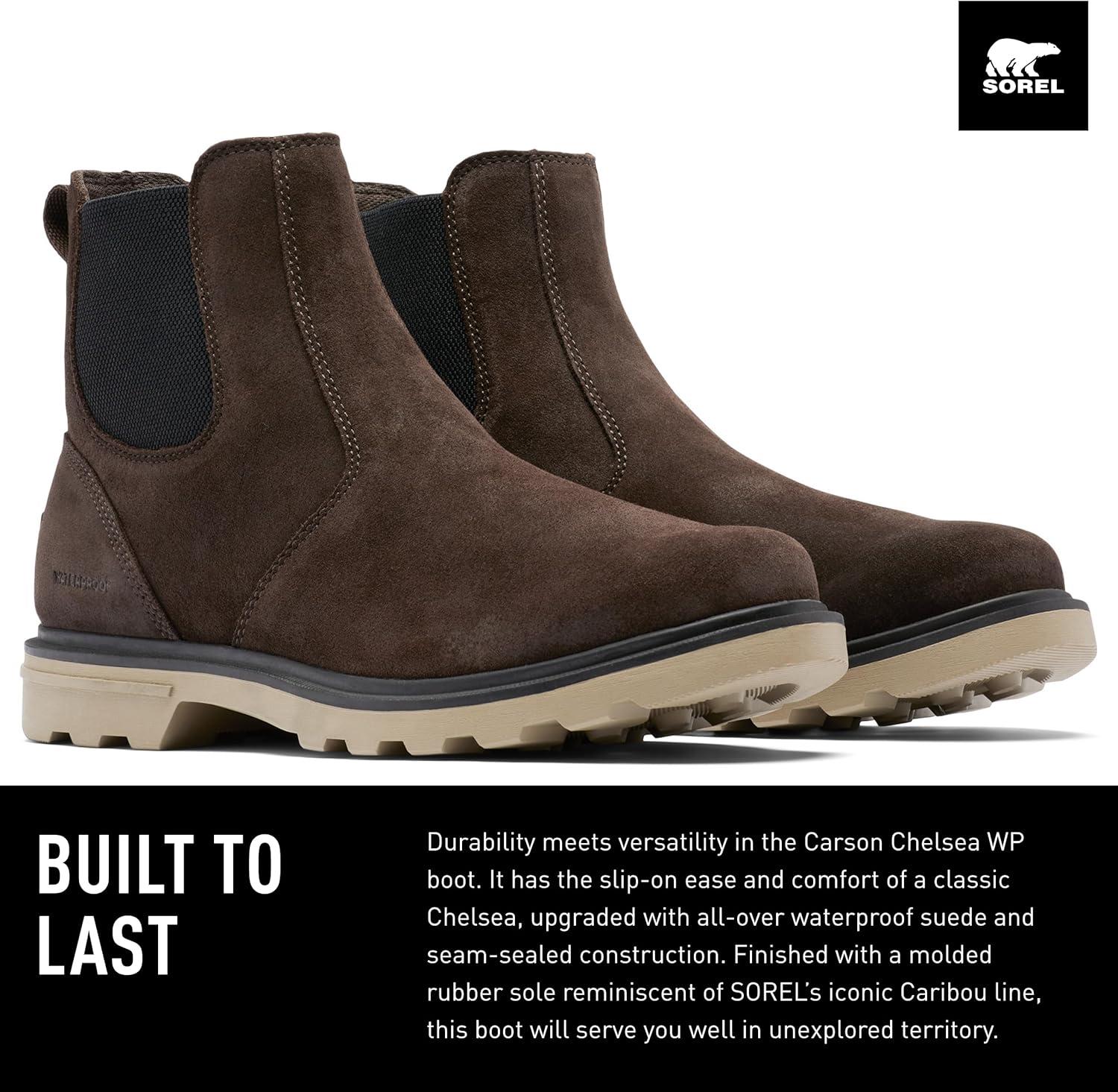 BUILT TO LAST Durability meets versatility in the Carson Chelsea WP boot. It has the slip-on ease and comfort of a classic Chelsea, upgraded with all-over waterproof suede and seam-sealed construction. Finished with a molded rubber sole reminiscent of SOREL's iconic Caribou line, this boot will serve you well in unexplored territory.