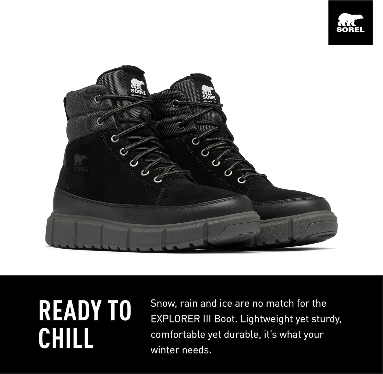 READY TO CHILL Snow, rain and ice are no match for the EXPLORER™ III Boot. Lightweight yet sturdy, comfortable yet durable, it's what your winter needs. Other features of the MEN'S SOREL EXPLORER™ III Boot include: