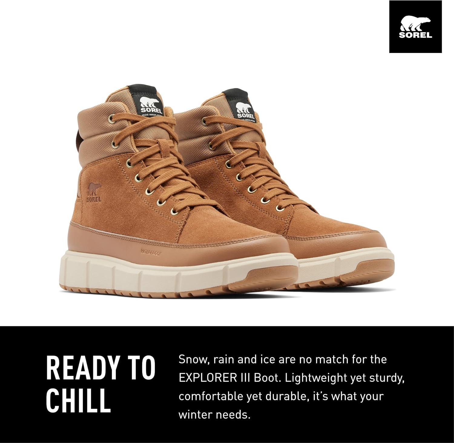 READY TO CHILL Snow, rain and ice are no match for the EXPLORER™ III Boot. Lightweight yet sturdy, comfortable yet durable, it's what your winter needs. Other features of the MEN'S SOREL EXPLORER™ III Boot include:
