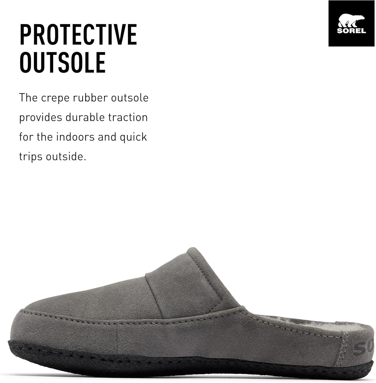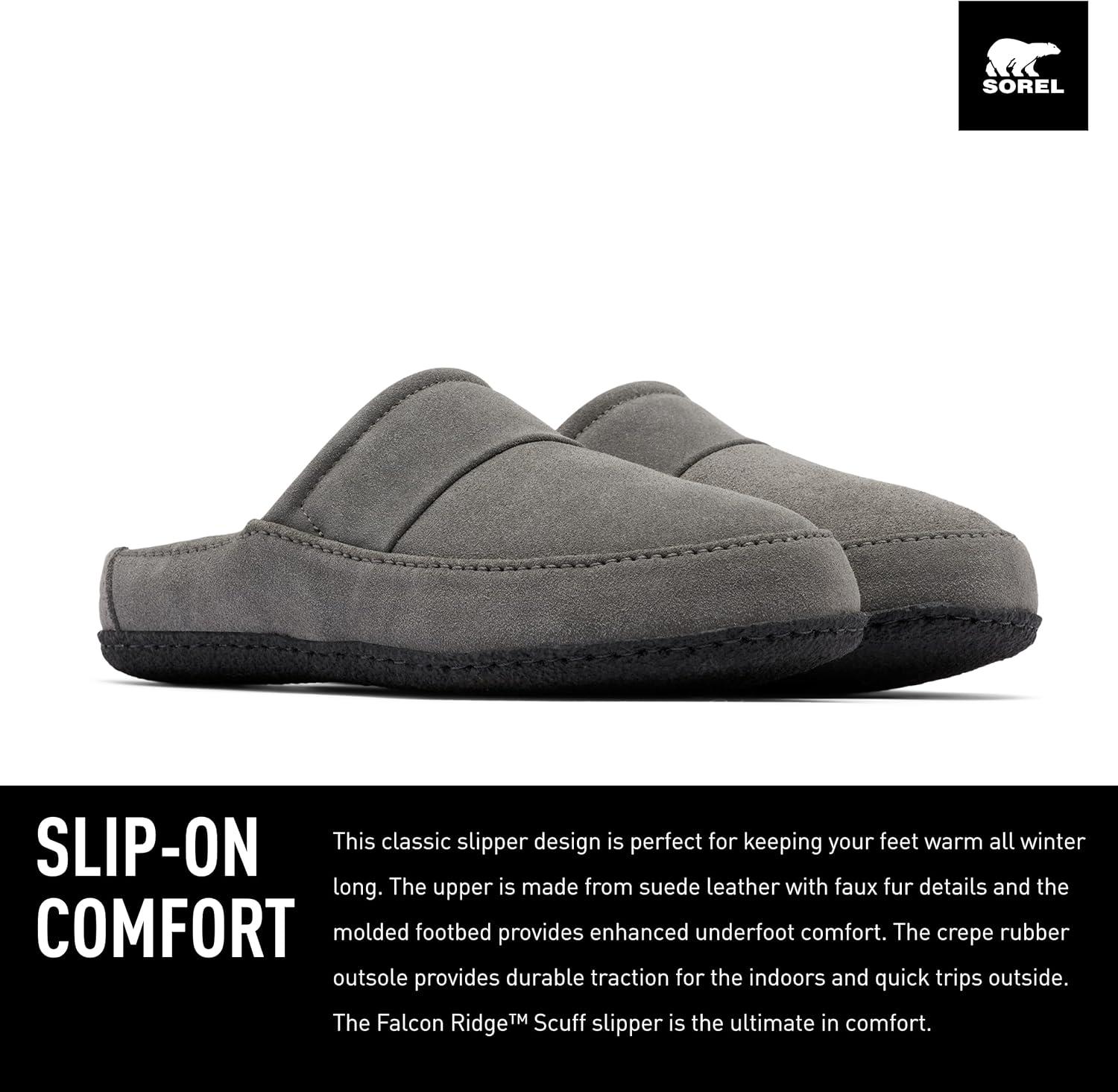 SLIP-ON COMFORT This classic slipper design is perfect for keeping your feet warm all winter long. The upper is made from suede leather with faux fur details, and the molded footbed provides enhanced underfoot comfort. The crepe rubber outsole provides durable traction for the indoors and quick trips outside. The Falcon Ridge™ Scuff slipper is the ultimate in comfort.