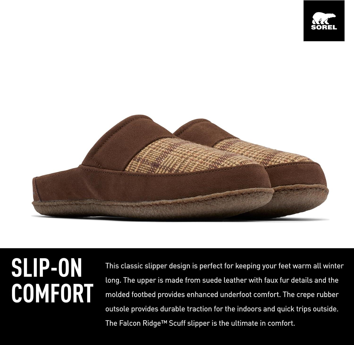 SLIP-ON COMFORT This classic slipper design is perfect for keeping your feet warm all winter long. The upper is made from suede leather with faux fur details, and the molded footbed provides enhanced underfoot comfort. The crepe rubber outsole provides durable traction for the indoors and quick trips outside. The Falcon Ridge™ Scuff slipper is the ultimate in comfort.
