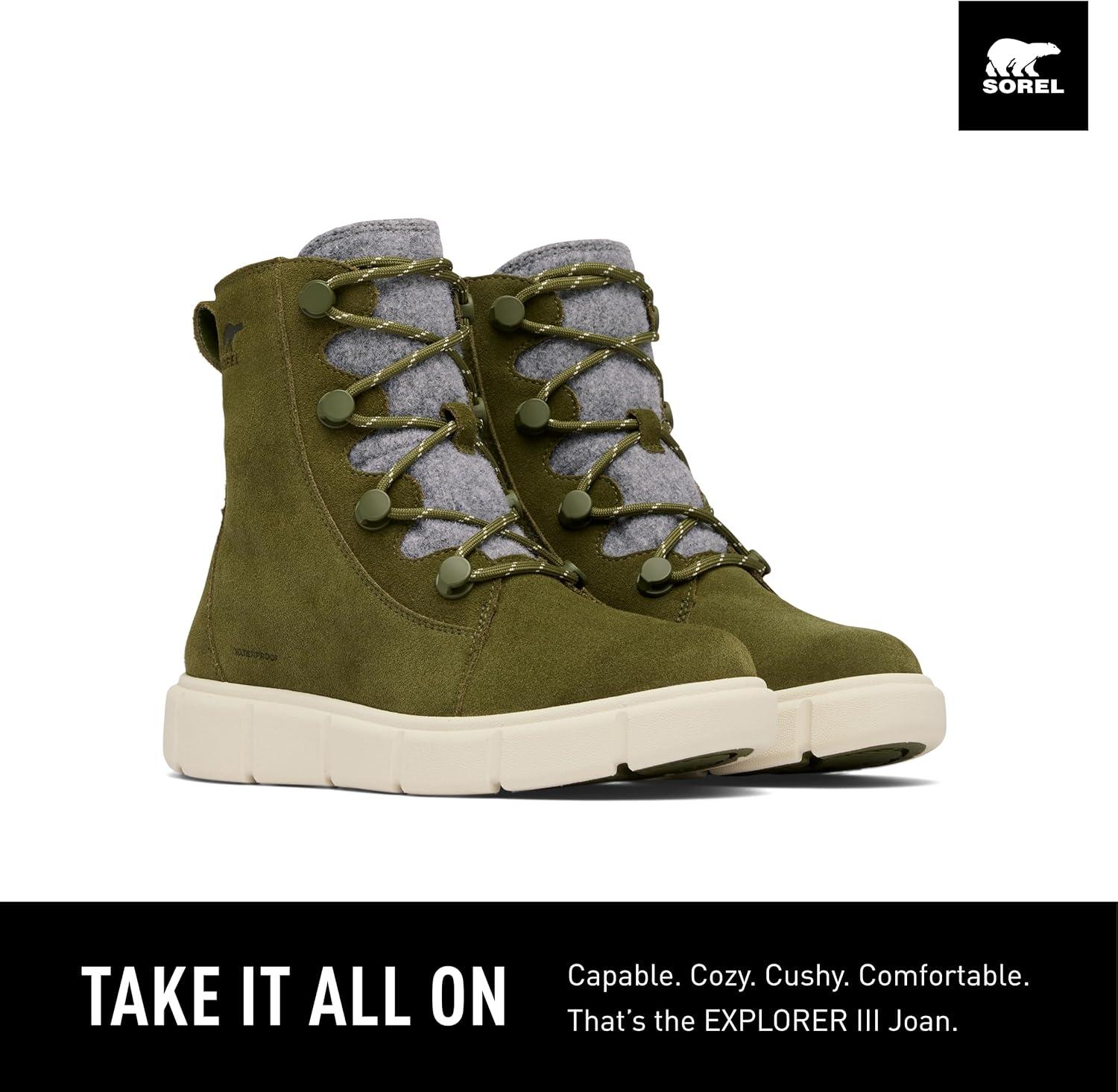 DO IT ALL When you're off to explore, the last thing you want to think about is if your boots can handle it. Joan is always up for anything, thanks to all-day comfort, just-right warmth and I-got-this tread. Other features of the WOMEN'S SOREL EXPLORER™ III Joan Cozy include: