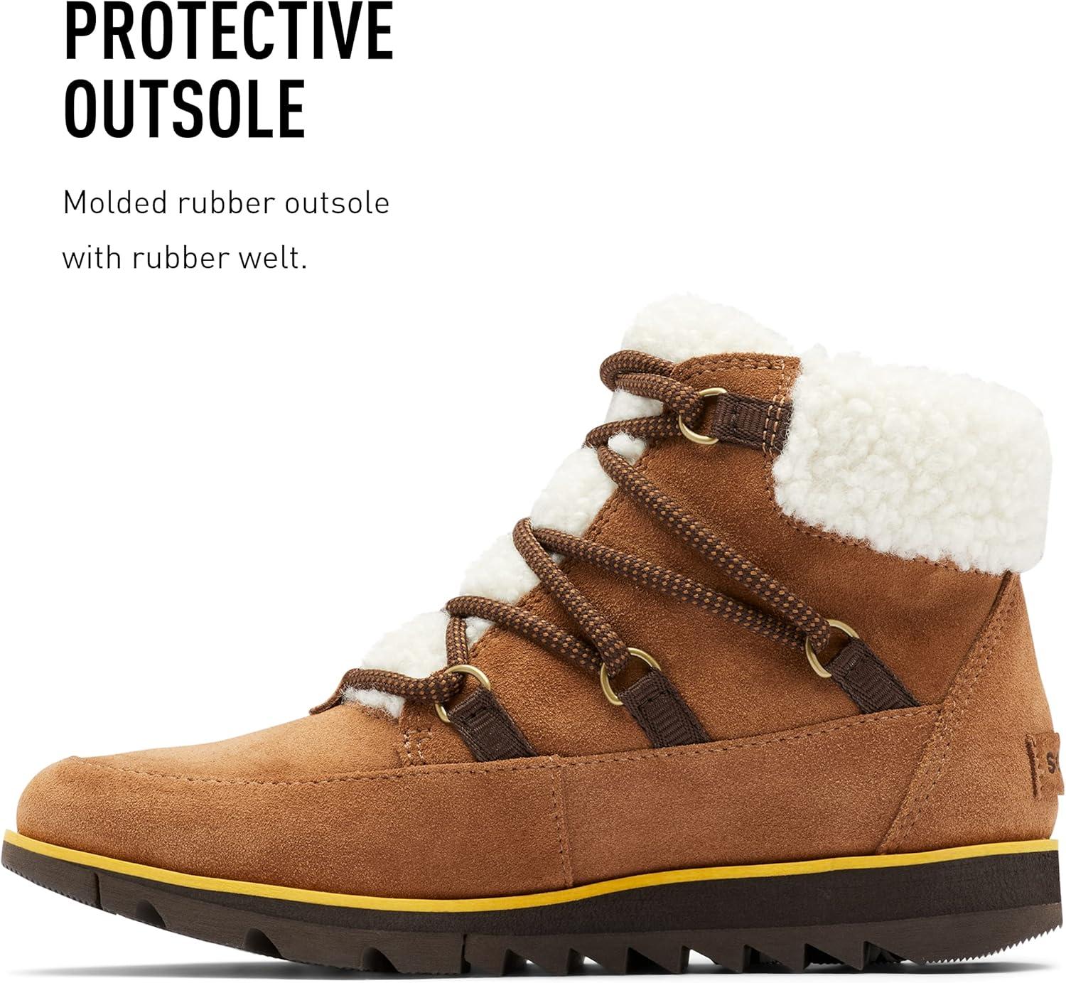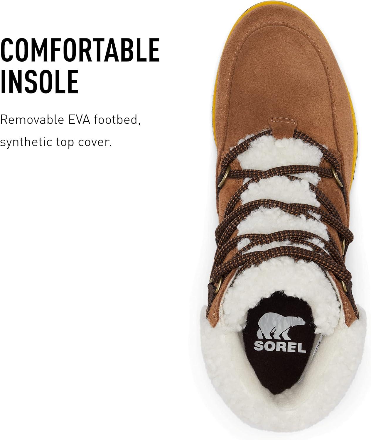Rugged laces meet genuine shearling in this one-of-a-kind bootie. This boot features show-stopping waterproof suede, a genuine shearling collar with soft microfleece lining, an EVA footbed, and molded rubber sole for traction during rainy days. Founded in 1962, SOREL combines expert craftsmanship and of-the-moment design to create all-season footwear. What began decades ago with premium boots, crafted with an unparalleled balance of construction and protection, is now a brand dedicated to both functionality and fashion. Here at SOREL, we believe you are your most powerful tool and the determination you find within is an unstoppable force. SOREL challenges the status quo by creating unexpected footwear that pushes the boundaries of function-first fashion. We stay in motion so you can push yourself forward.