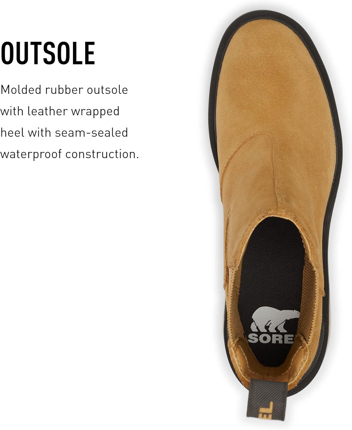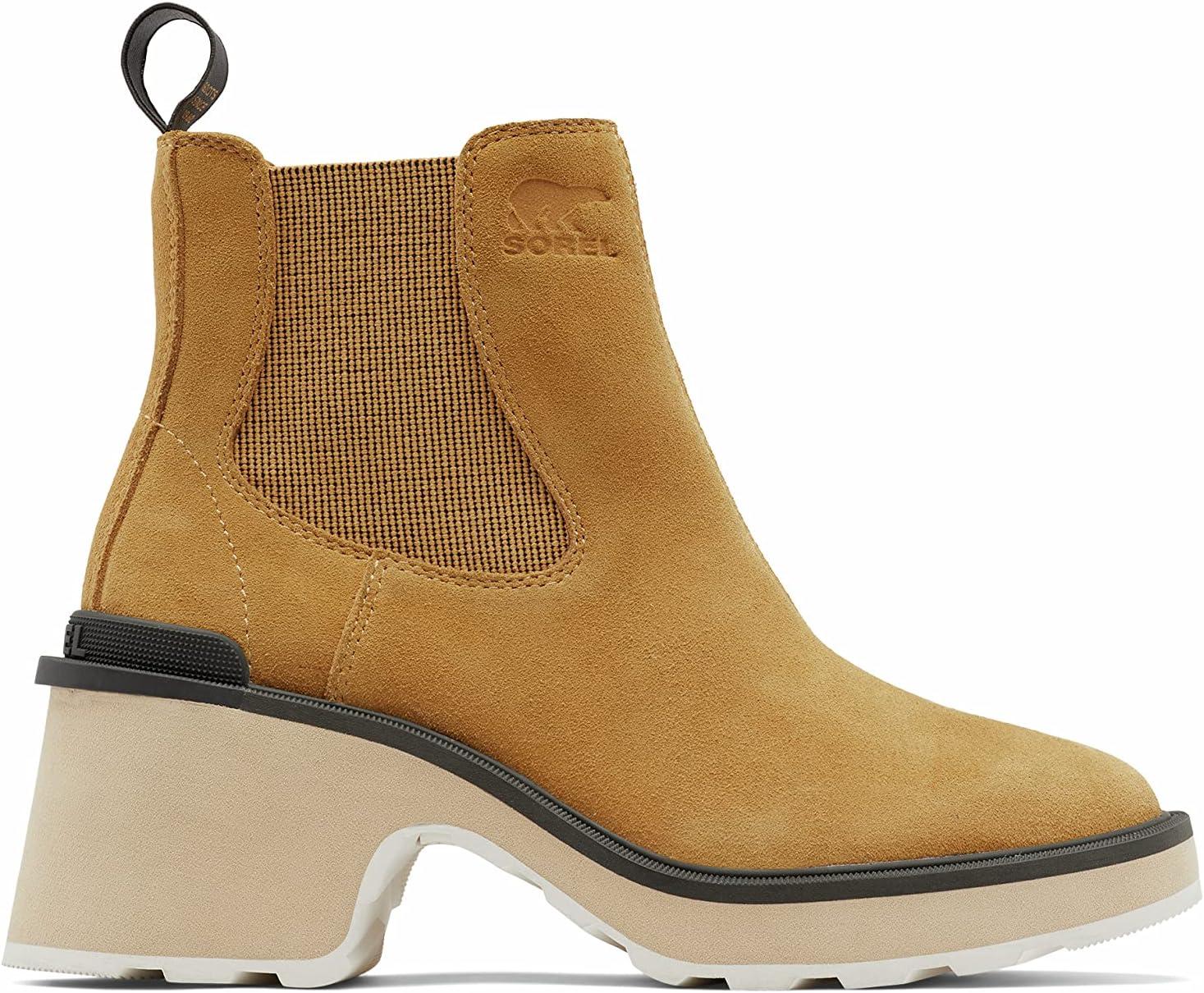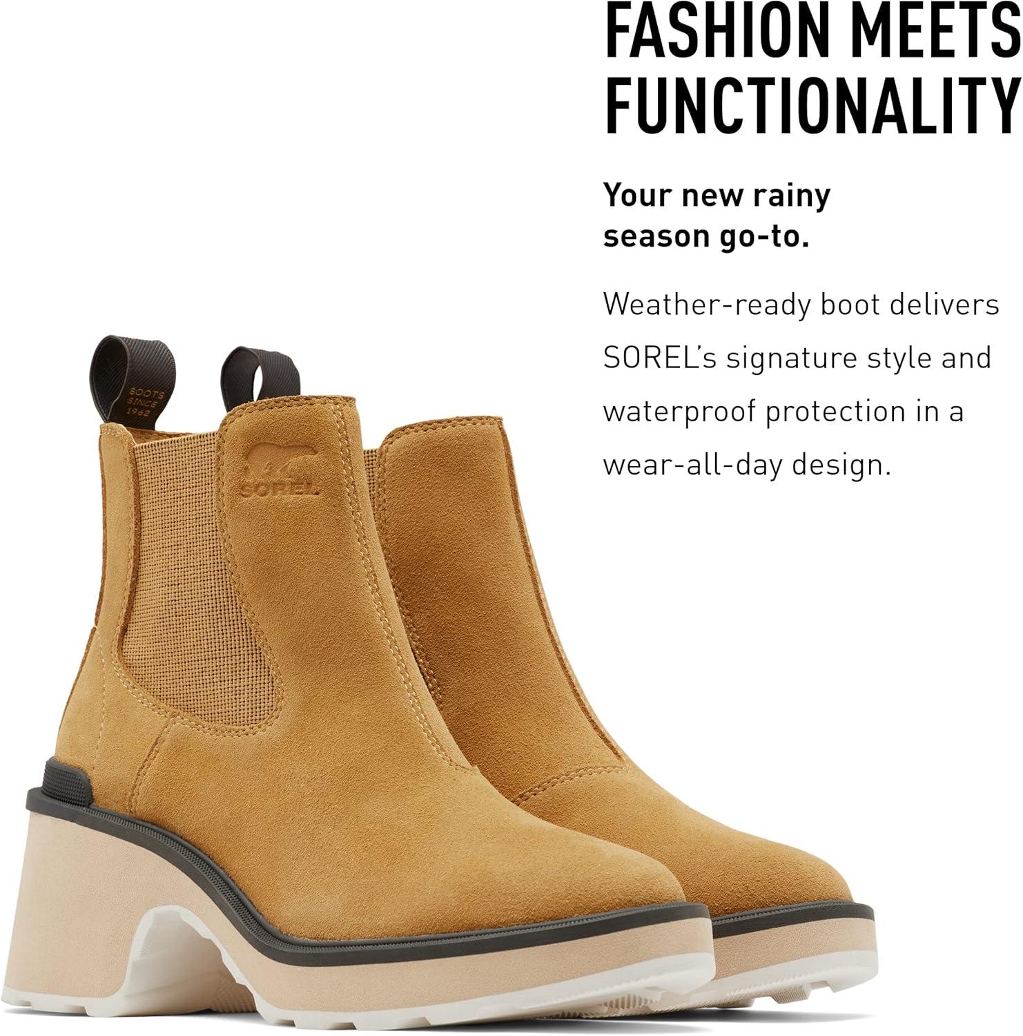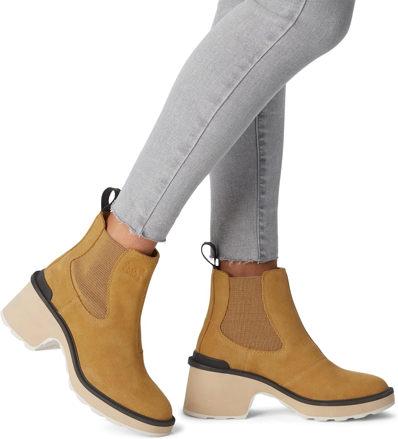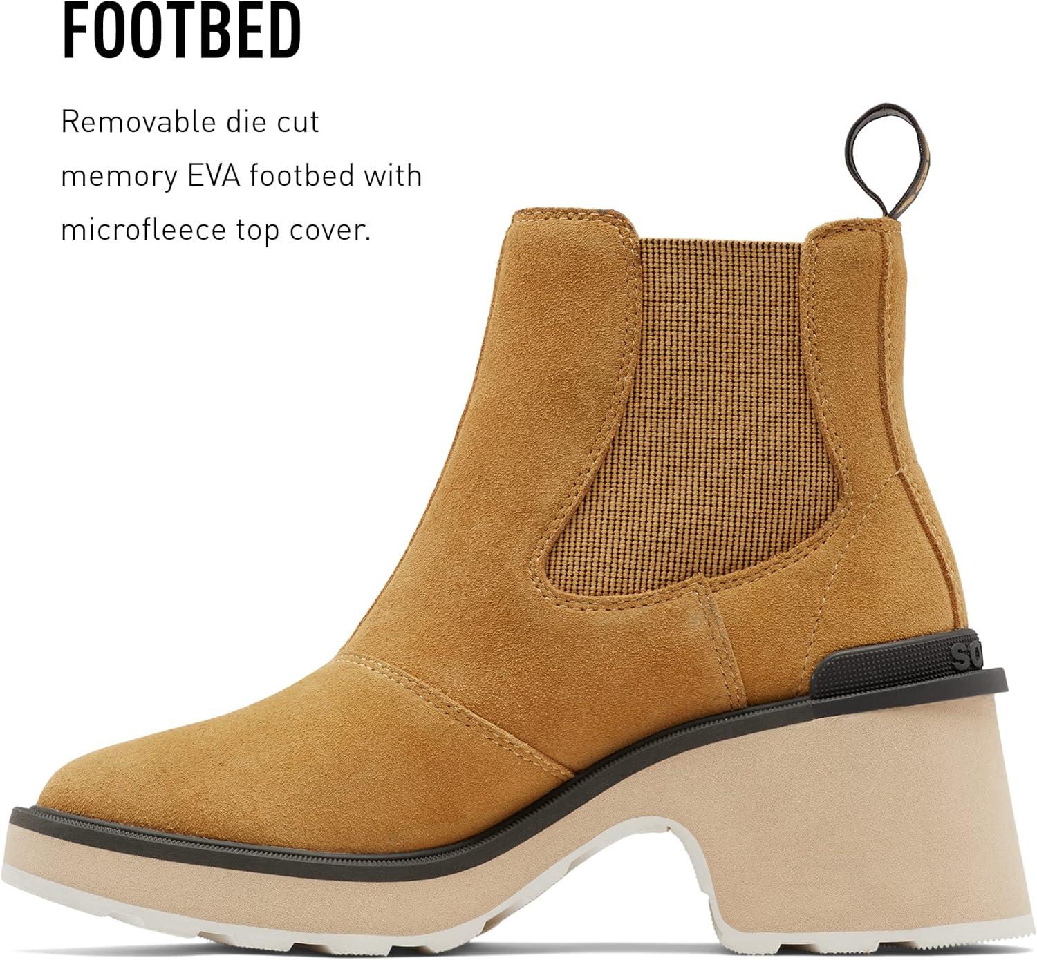 Raising the bar on classic Chelsea Boots, SOREL's Women's Hi-Line Heel Chelsea Boots are the perfect blend of style and function. These Boots feature a minimal, durable design. These rain Boots are crafted from waterproof suede, ensuring your feet stay dry and comfortable through all your adventures. The chunky platform and block heel add a fashionable touch, while the high-quality lug sole provides excellent traction and support. The cozy, memory foam-like EVA insole ensures good footing, and the inclusion of a nylon heel pull tab allows for effortless entry. Available in multiple colors and styles, these slip-on Boots are perfect for everyday wear and are easy to pair with any outfit. Don't let wet conditions hold you back—these waterproof shoes are great for any rainy day.