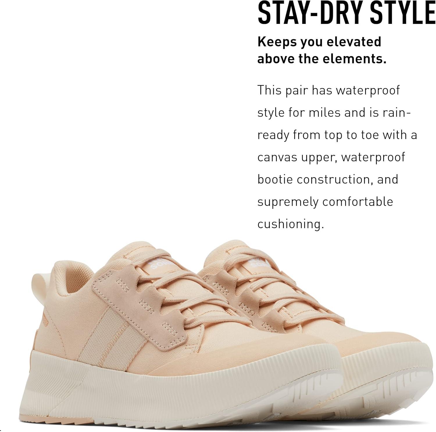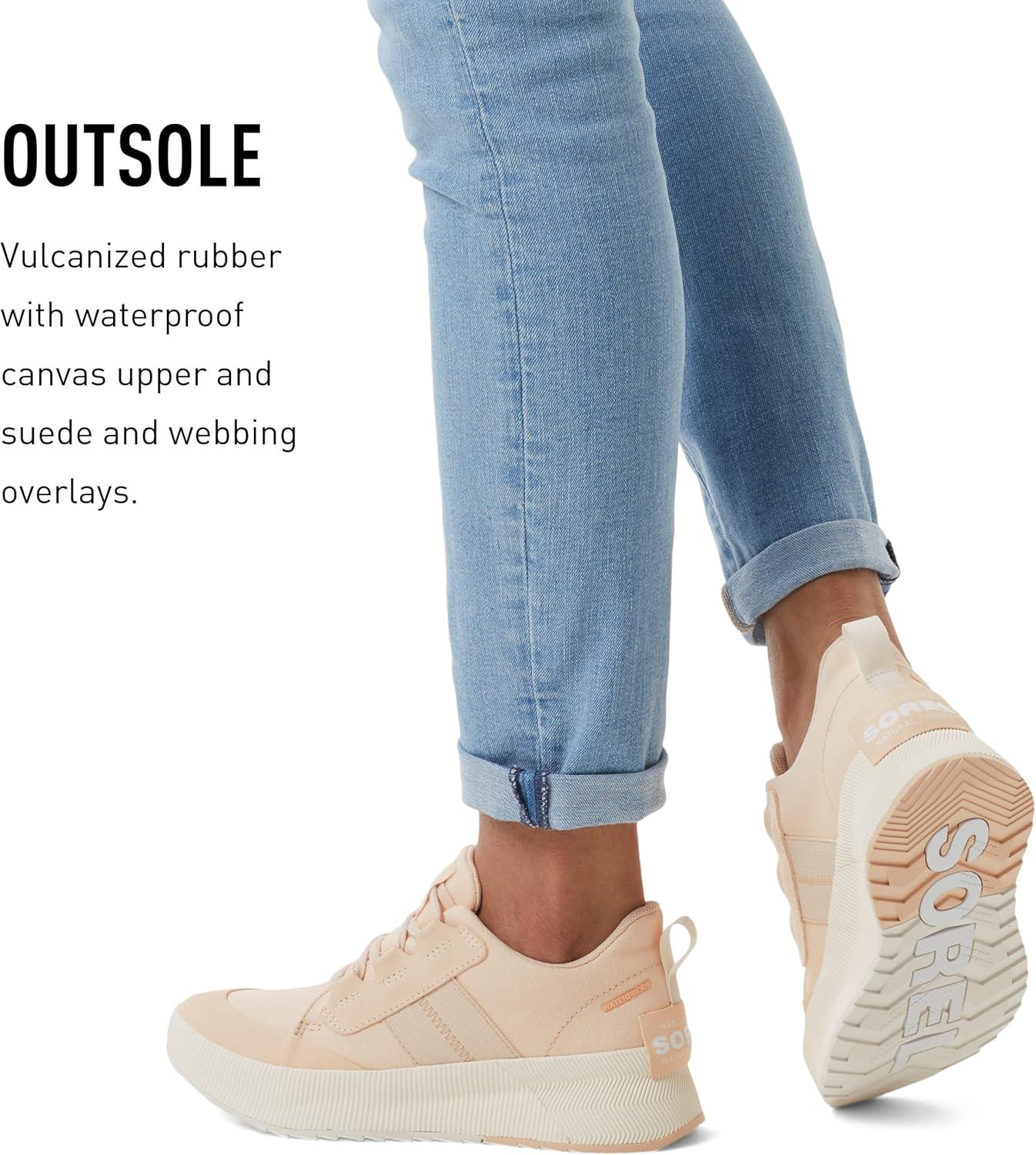 Stay stylish and dry with the SOREL Women's Out N About III Low Canvas Sneakers. These rain-ready sneakers are the perfect choice for all-weather walks and runs, making them great for long walks on rainy days. These sneakers feature a waterproof canvas upper with suede and webbing overlays as well as a waterproof Bootie construction. The vulcanized toe cap and the rubber sole provide a stable grip on any surface. Made of a premium vulcanized rubber and webbing overlays, these sneakers are typically better against abrasion. Additionally, the vulcanized midsole enhances the shoe's durability and longevity, making them a great investment for any shoe lover. The removable molded EVA footbed and textile top cover provides supreme comfort, and the laces allow for an adjustable fit. So if you want a sneaker that lives up to its name, the Out N About III Low Sneaker Canvas Waterproof is a perfect choice.