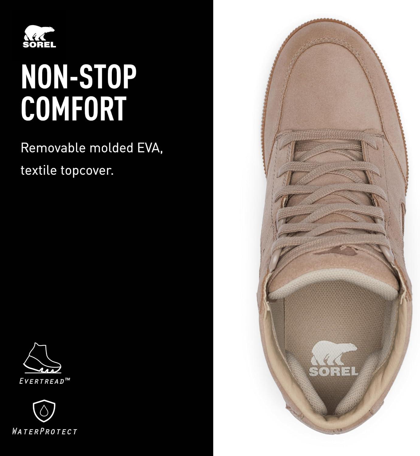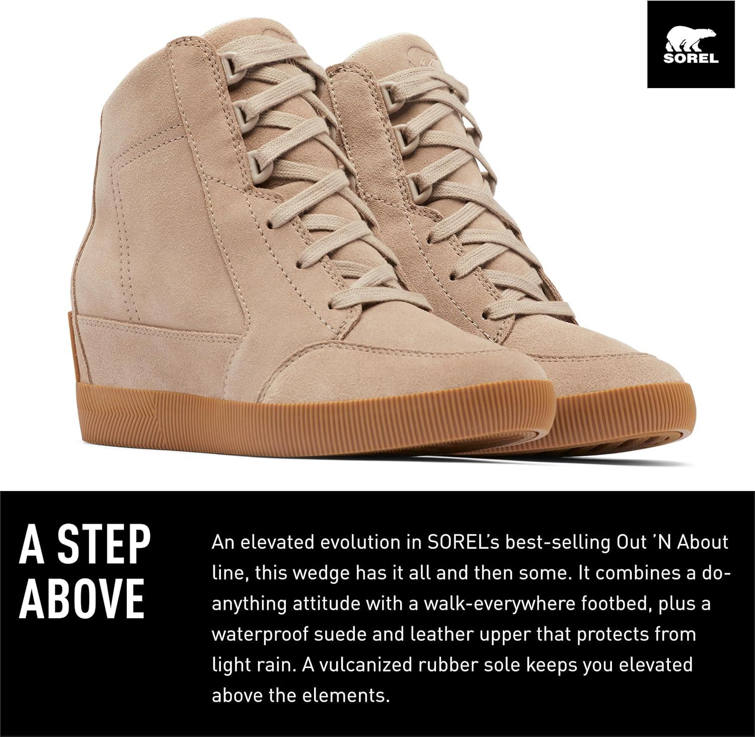 A STEP ABOVE An elevated evolution in SOREL’s best-selling Out ’N About line, this wedge has it all and then some. It combines a do-anything attitude with a walk-everywhere footbed, plus a waterproof suede and leather upper that protects from light rain. A vulcanized rubber sole keeps you elevated above the elements.